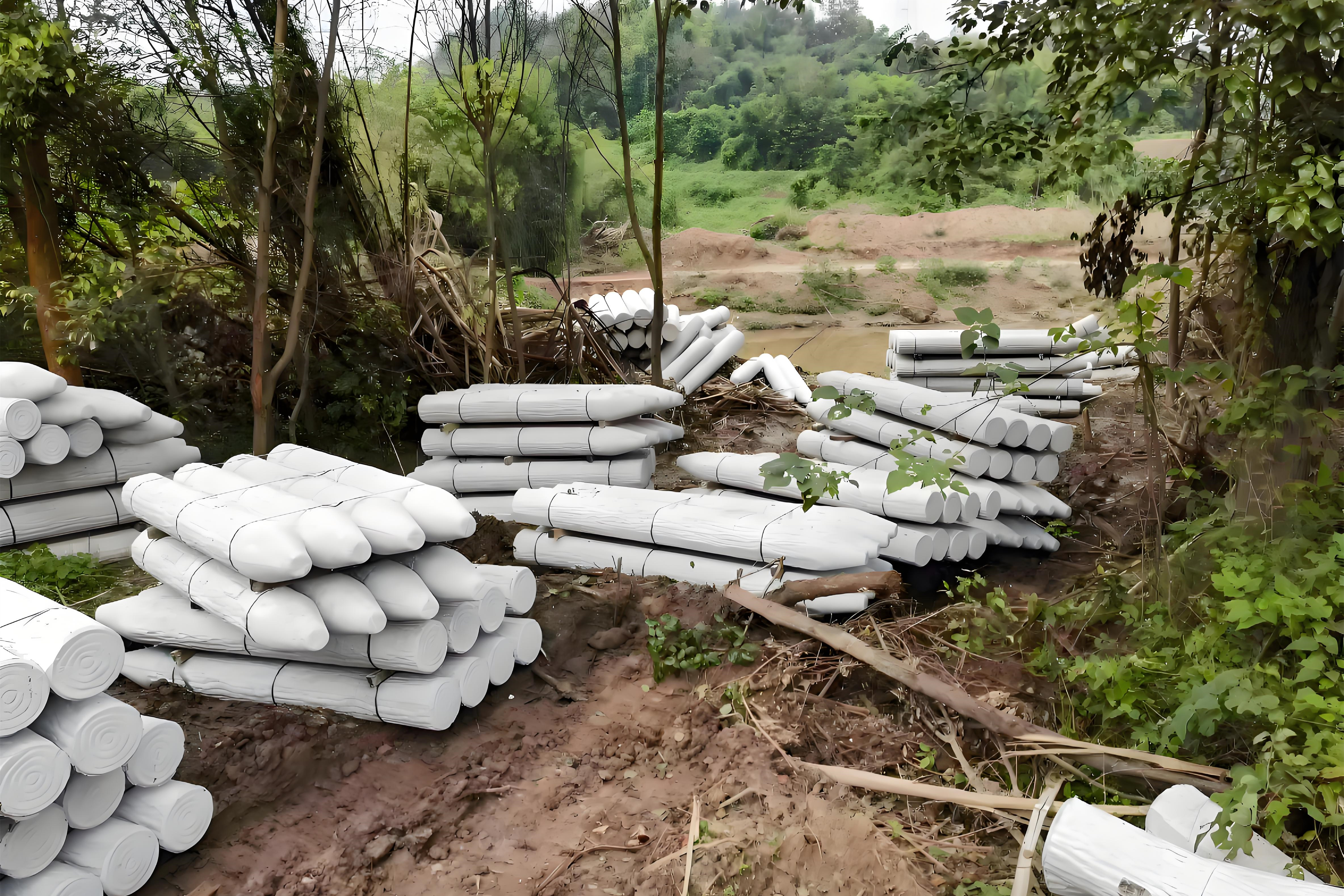 第二個風險是 “材料運輸和存儲受影響”。汛期雨水多,仿木樁若露天存放容易受潮,影響后期安裝;運輸時道路泥濘,也可能延誤工期。