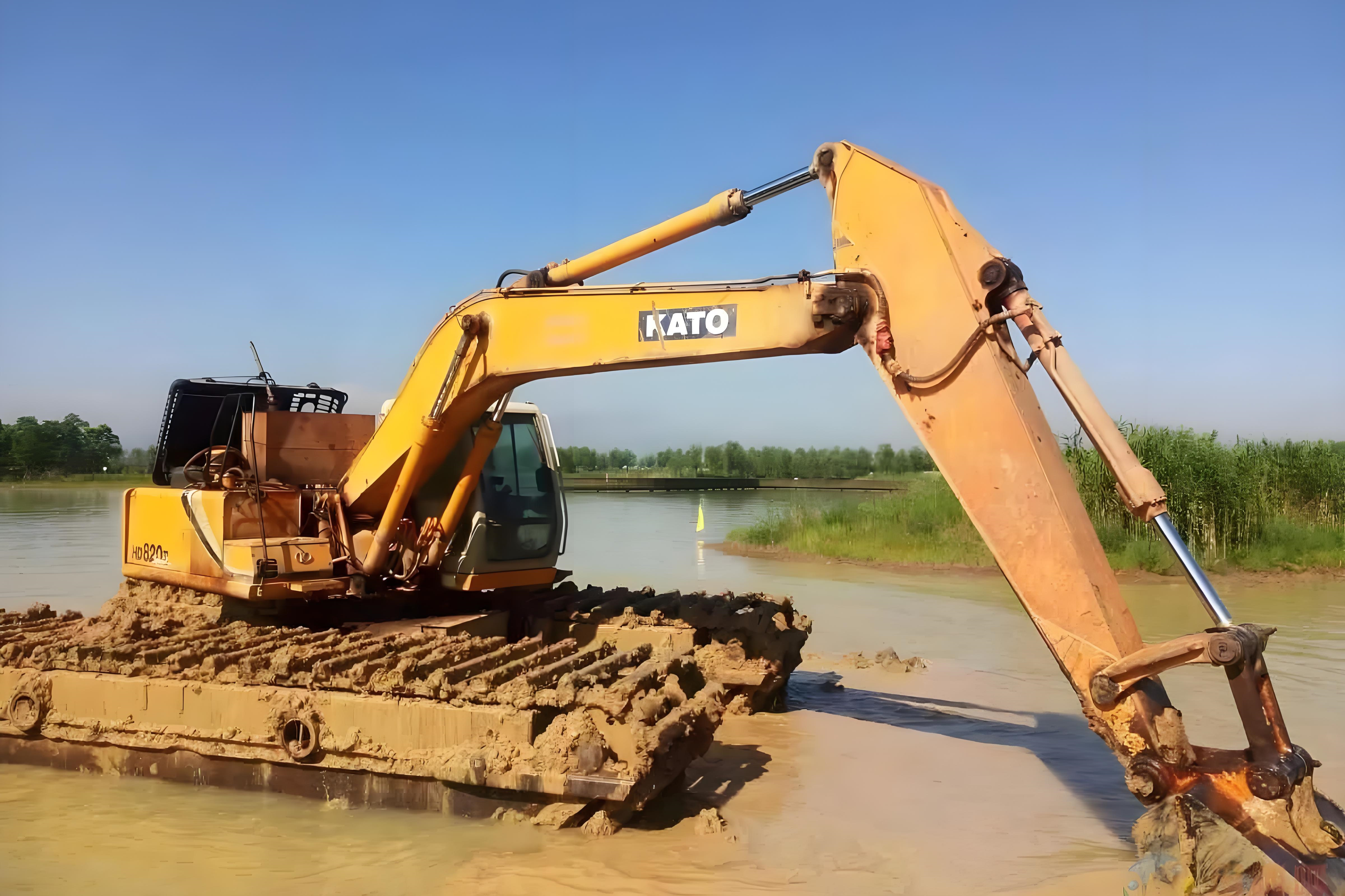 如果魚塘不想放水(比如里面還有魚苗,或者水源不好補充),就用 “水上挖機”。這種挖機底部有浮箱,能直接在水面上作業。