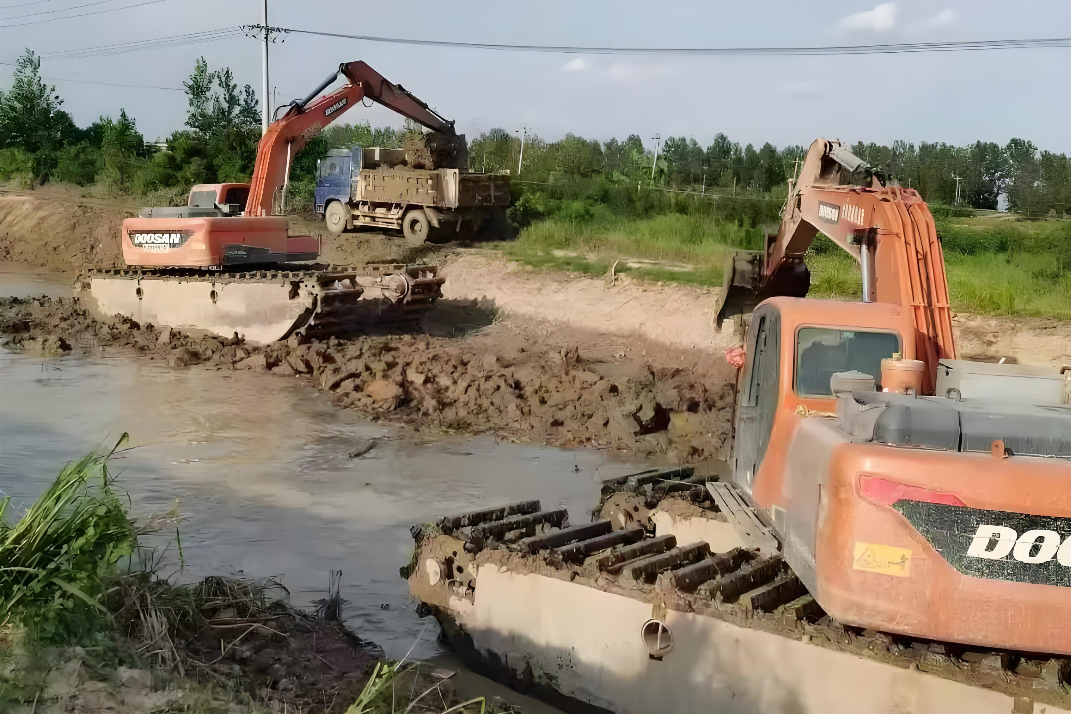 湖南的塘口有大有小,水深也不一樣。如果是水深 1 米以內(nèi)的淺塘,普通履帶挖掘機(jī)墊上鋼板就能作業(yè);要是水深超過 1.5 米,就得用水陸兩用挖掘機(jī) —— 這種機(jī)器像 “兩棲坦克”,履帶寬,在淤泥里不容易陷,鏟斗也經(jīng)過改裝,比普通挖斗淺但容積大,裝淤泥不容易漏。2. 清淤得按 “順序” 來,不然越挖越亂