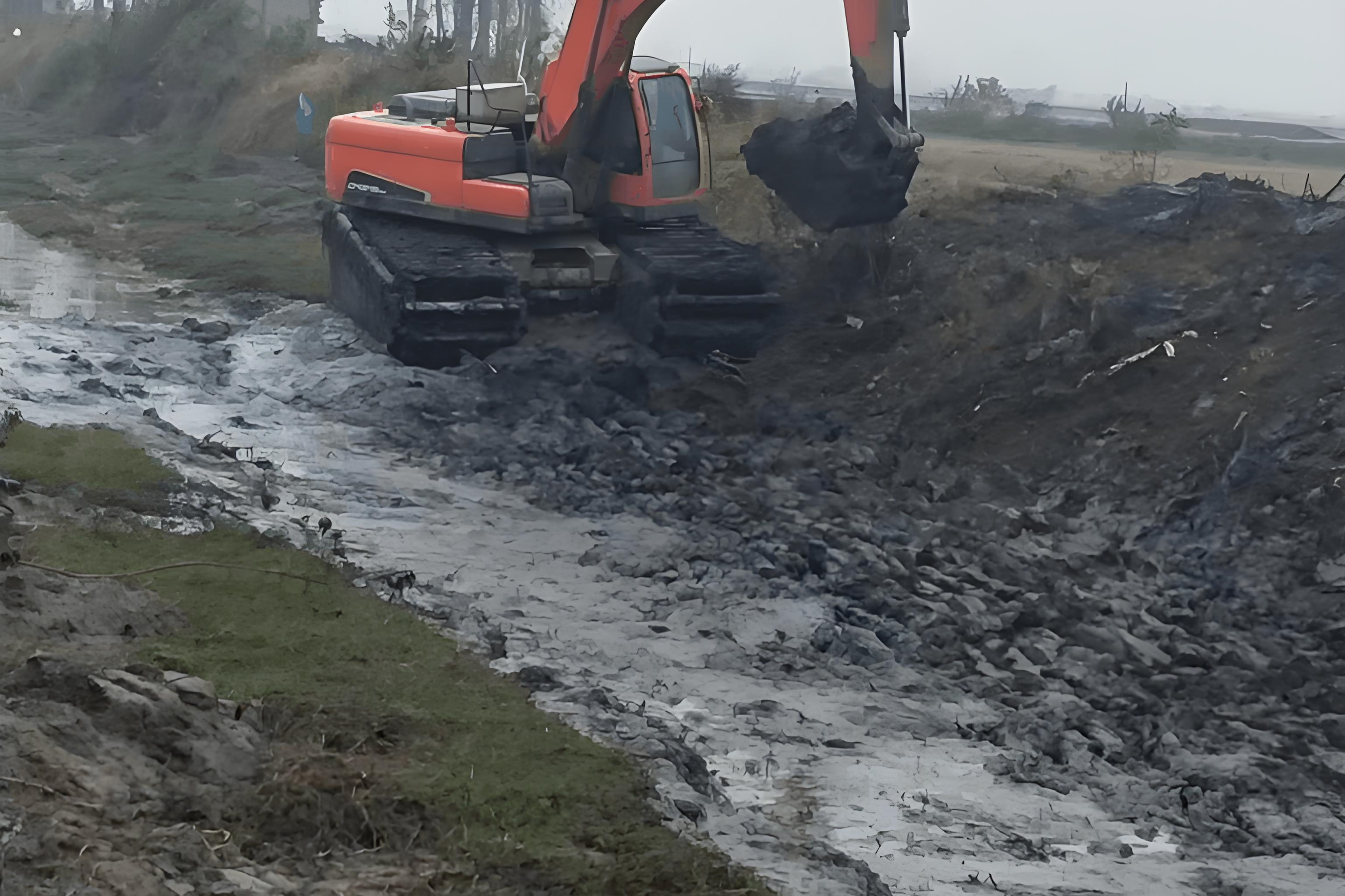 從淤泥情況說,如果是稀泥層,挖機鏟斗一挖就成團,作業順暢;但要是水下有硬土塊、石頭,甚至廢棄的漁網、鋼筋,就可能卡住鏟斗,得先清理障礙物才能繼續。